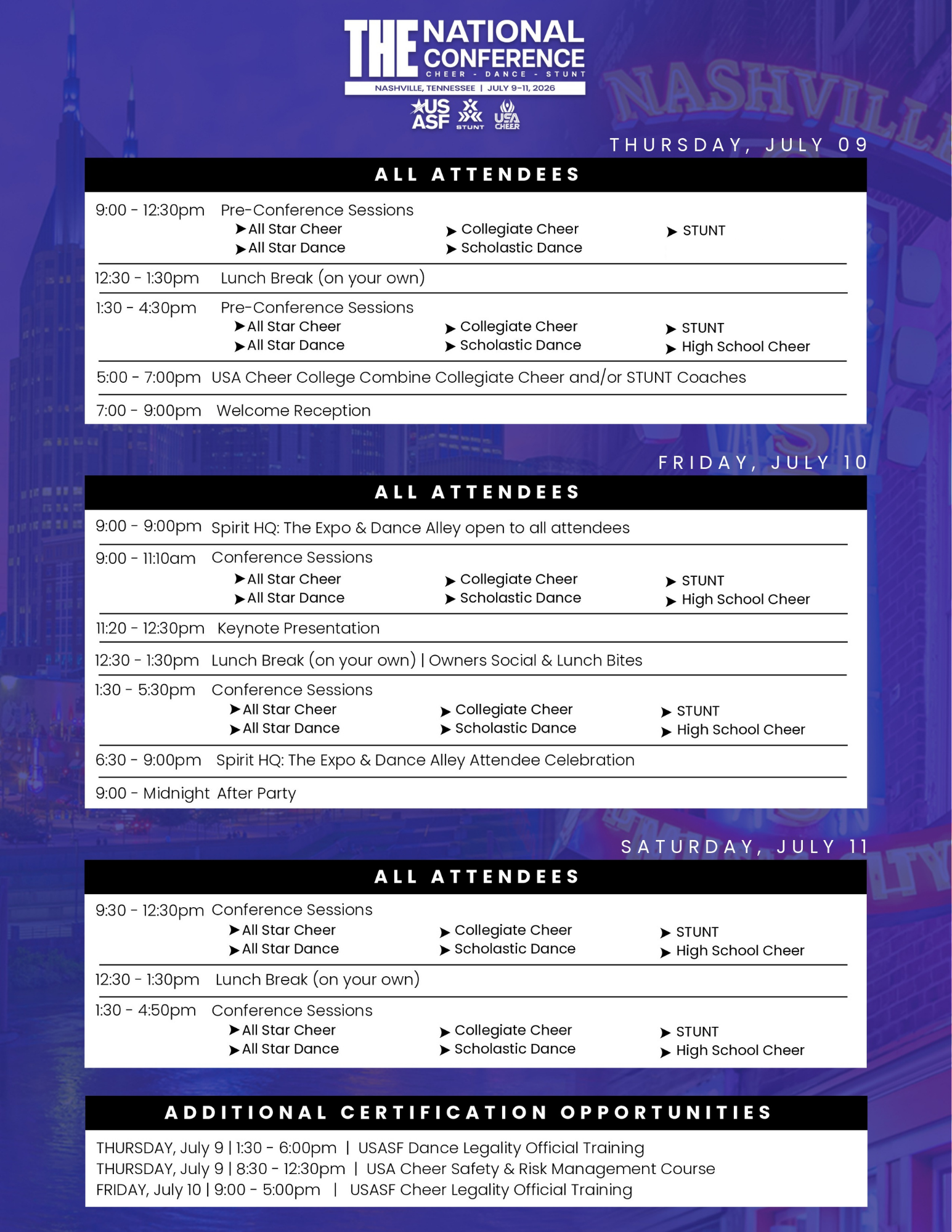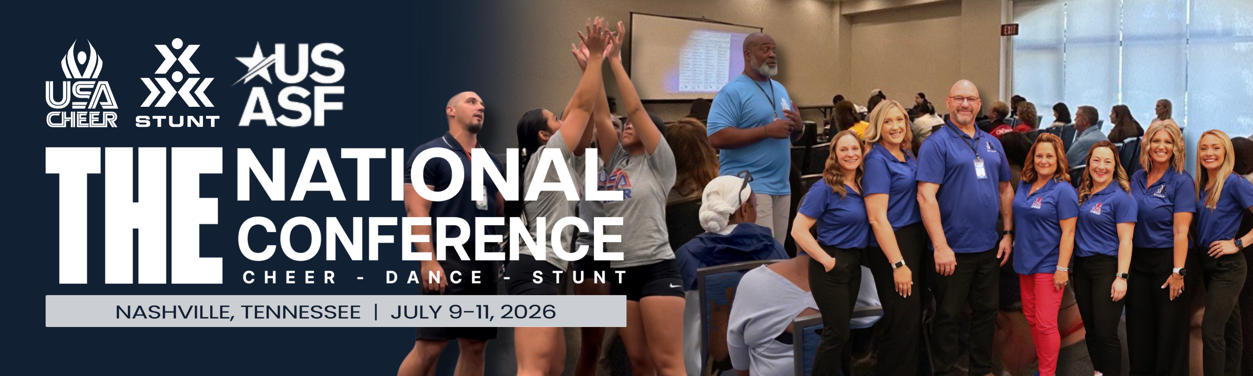 Youth/Rec, Junior High, High School, College Cheer and STUNT Coaches, join us in Nashville, July 9-11 as we share the stage with the USASF for the 2026 National Conference! Mark your calendars, start planning travel with your peers, and stay tuned to register for this year’s can’t-miss event!